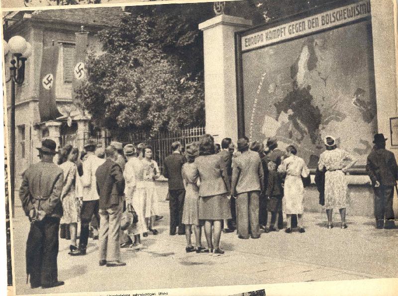 Dieses Bild illustriert wie die Nazis mit Europa Propaganda getrieben haben. Ob das Bild gestellt ist oder ob die Bevölkerung wirklich so interessiert die Karte ansah, als der Photograph abdrückte ist nicht mehr nachzuvollziehen.