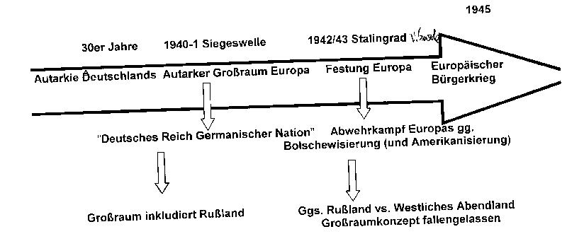 Wie in meiner Arbeit erläutert, wandelte sich die Europakonzeption der Nazis im Laufe ihrer Herrschaft. Dieser Wechsel vom Schlagwort "autarker Großraums Europa" (inkludiert Russland) zur "Festung Europa" (exlusive Russland) habe ich versucht graphisch in Pfeilform darzustellen.